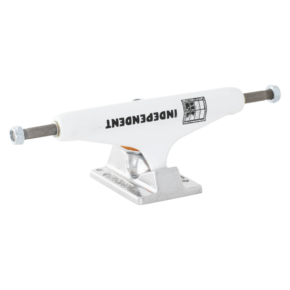 Die Stage 11 Evan Smith White Silver Standard Independent Skateboard Trucks sind für ultimative Haltbarkeit und Performance konzipiert. Entworfen von Evan Smith, verfügen diese Achsen über einen flachen weißen pulverbeschichteten Hanger mit einer gedruckten zerbrochenen Fenstergrafik, eine polierte silberne Grundplatte mit einem zerbrochenen Glaspaddruck auf dem Kingpin-Gehäuse, silberne Hardware und orangefarbene Bushings.