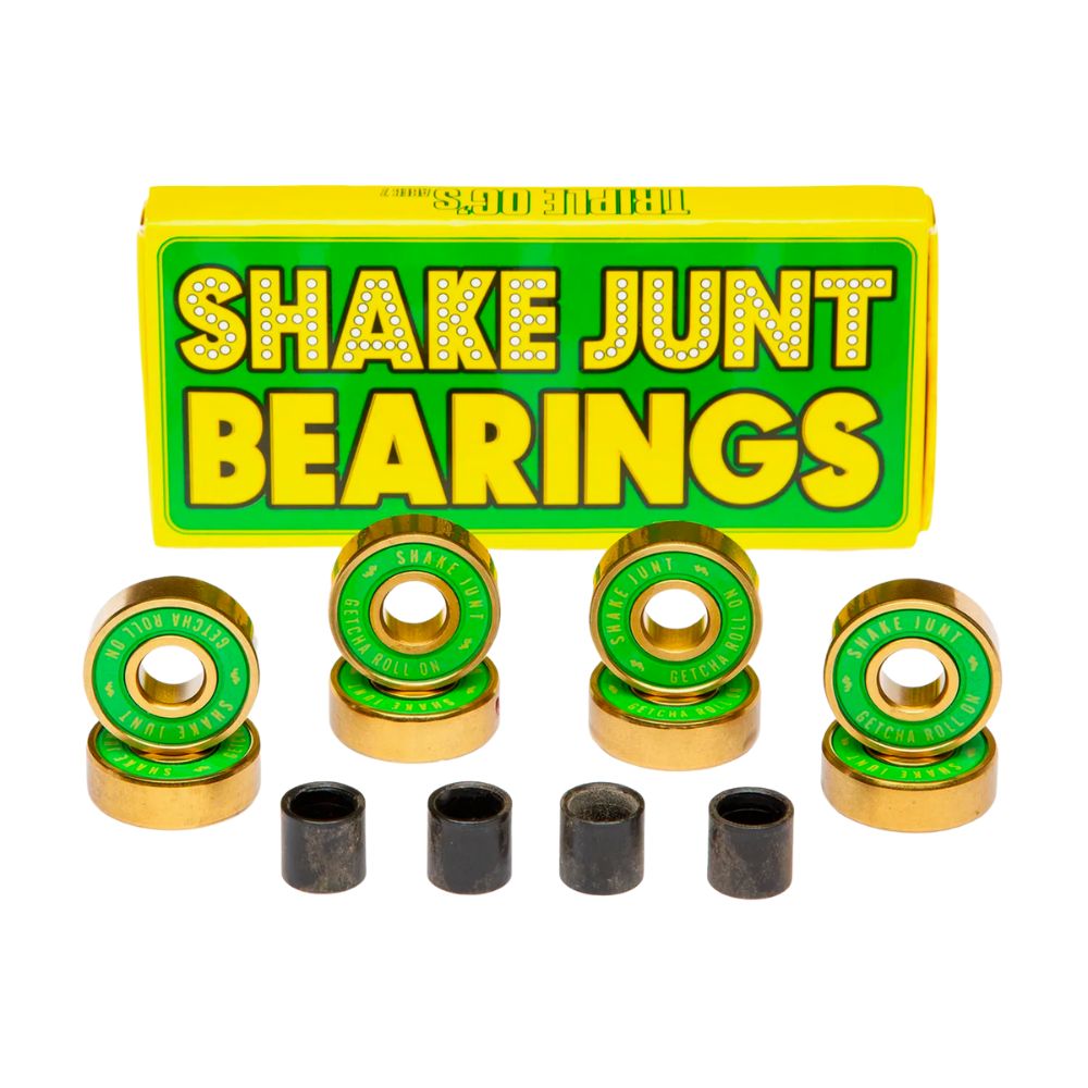Die Shake Junt Abec 7 Kugellager rollen sehr sanft. Sie wurden speziell von der amerikanischen Skatemarke Shake Junt entwickelt. Besser bekannt für ihre tollen Griptapes. Aber sie machen auch coole Lager. Diese Abec 7-Kugellager sind eine Stufe höher und leichtgängiger als ihre Abec 5-Variante. Hergestellt in Gold und Grün, absolut bombastisch.