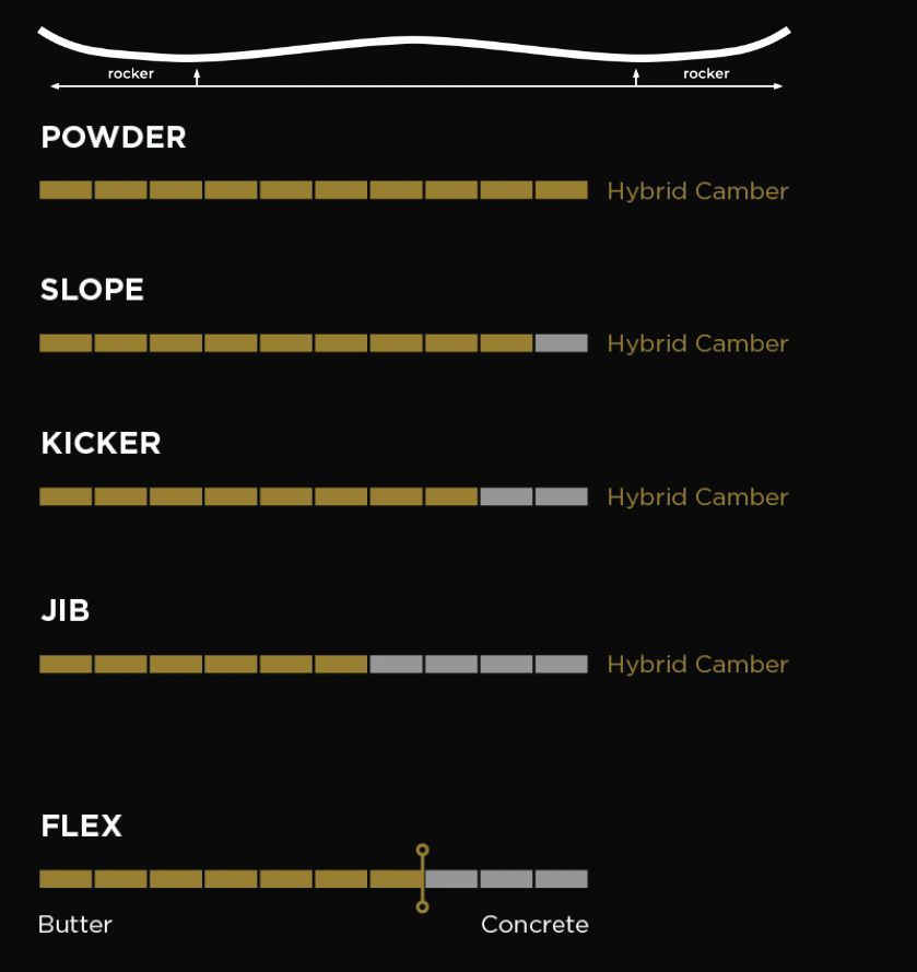 Hybrid Camber - Camber unter dem Fuß für Grip, Pop und Stabilität, kombiniert mit mildem Rocker für extra Float, Fehlerverzeihung und sanfte Schwungeinleitung in variablem Schnee.
