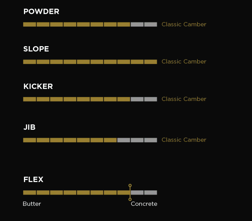 Directional Classic Camber - traditioneller Camber von der Nose bis zum Tail für maximale Präzision, Grip und Kraftübertragung. Dieses Profil liefert pures Ansprechverhalten, Stabilität und Geschwindigkeit, ohne zu verzeihen: Je härter Sie pushen, desto besser ist die Leistung.
