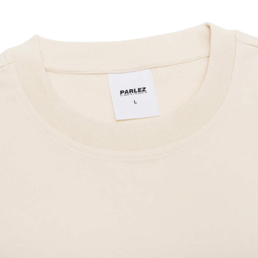 Das Parlez Braco T-Shirt Ecru ist ein kurzärmeliges T-Shirt aus 100% Bio-Baumwolle mit einem klassischen gerippten Rundhalsausschnitt. Mit einem großen Druck auf dem Rücken und einem kleineren Druck auf der Brust.