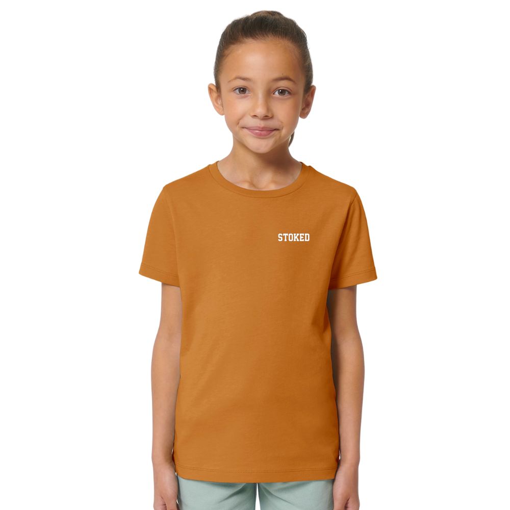 Met de Kids Mini Script T-Shirt Day Fall van Stoked Board Co represent je jouw favoriete boardmerk met classy style. Het Stoked Script logo subtiel op de borst laat zien hoe hyped jij bent en geeft een mooi contrast op de T-shirt. De verstevigingsband in de hals en het breed dubbel stiksel maken deze T-shirt helemaal af.