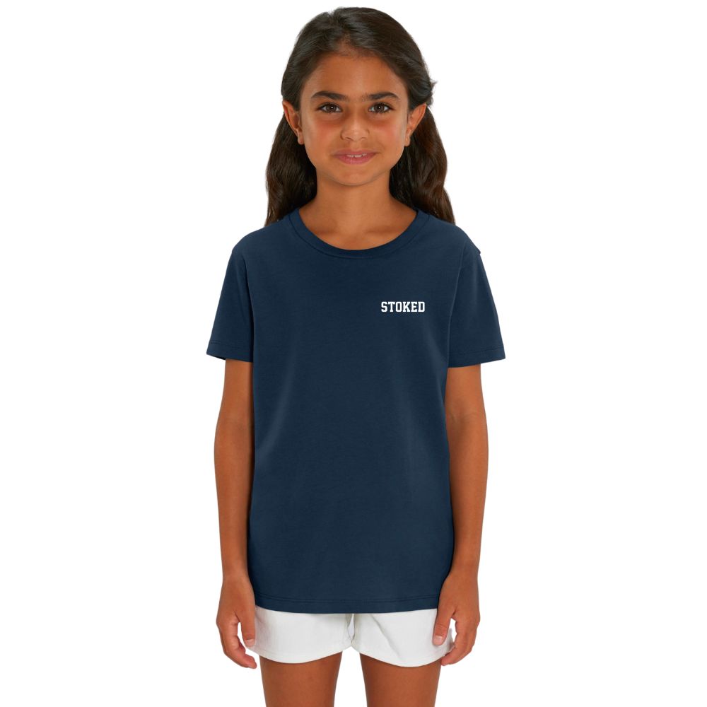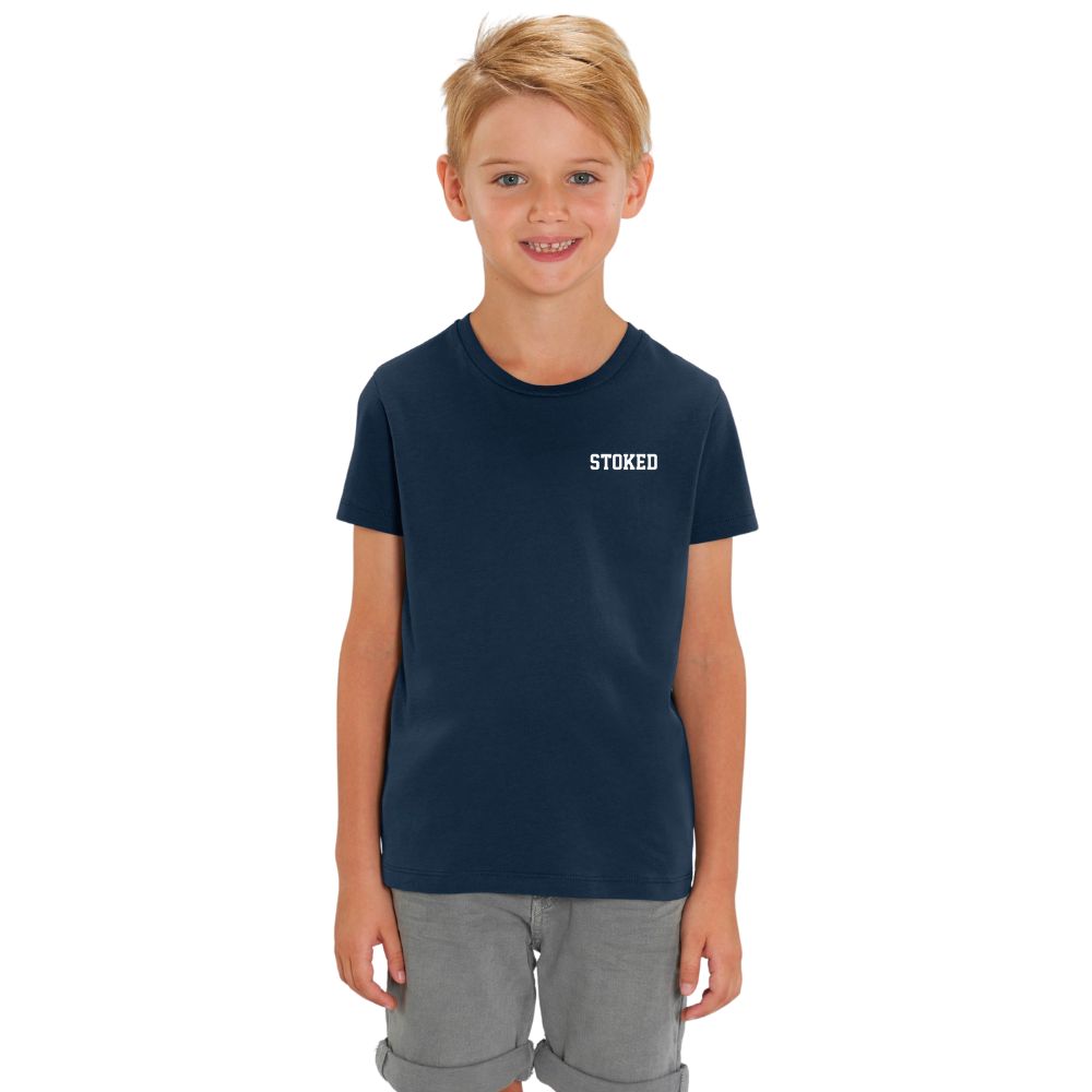 Met de Kids Mini Script T-Shirt French Navy van Stoked Board Co represent je jouw favoriete boardmerk met classy style. Het Stoked Script logo subtiel op de borst laat zien hoe hyped jij bent en geeft een mooi contrast op de T-shirt. De verstevigingsband in de hals en het breed dubbel stiksel maken deze T-shirt helemaal af.