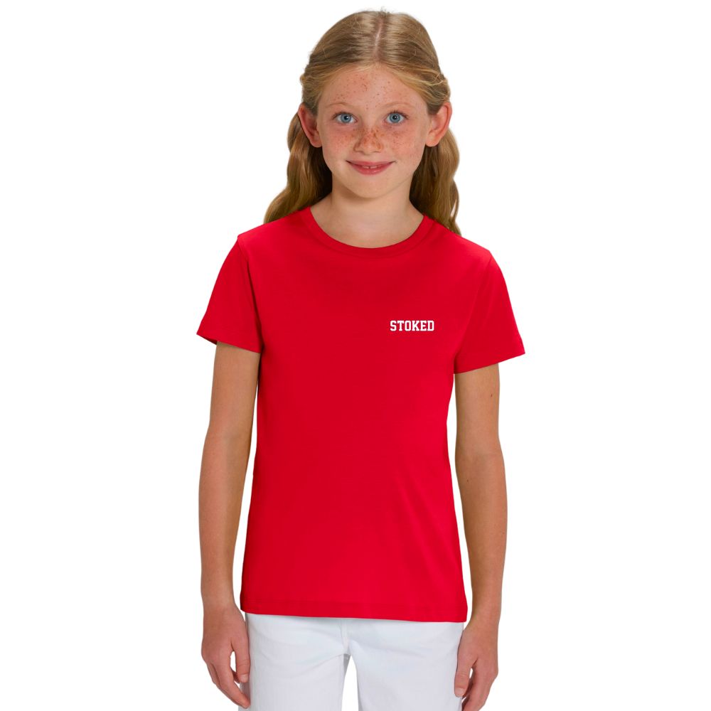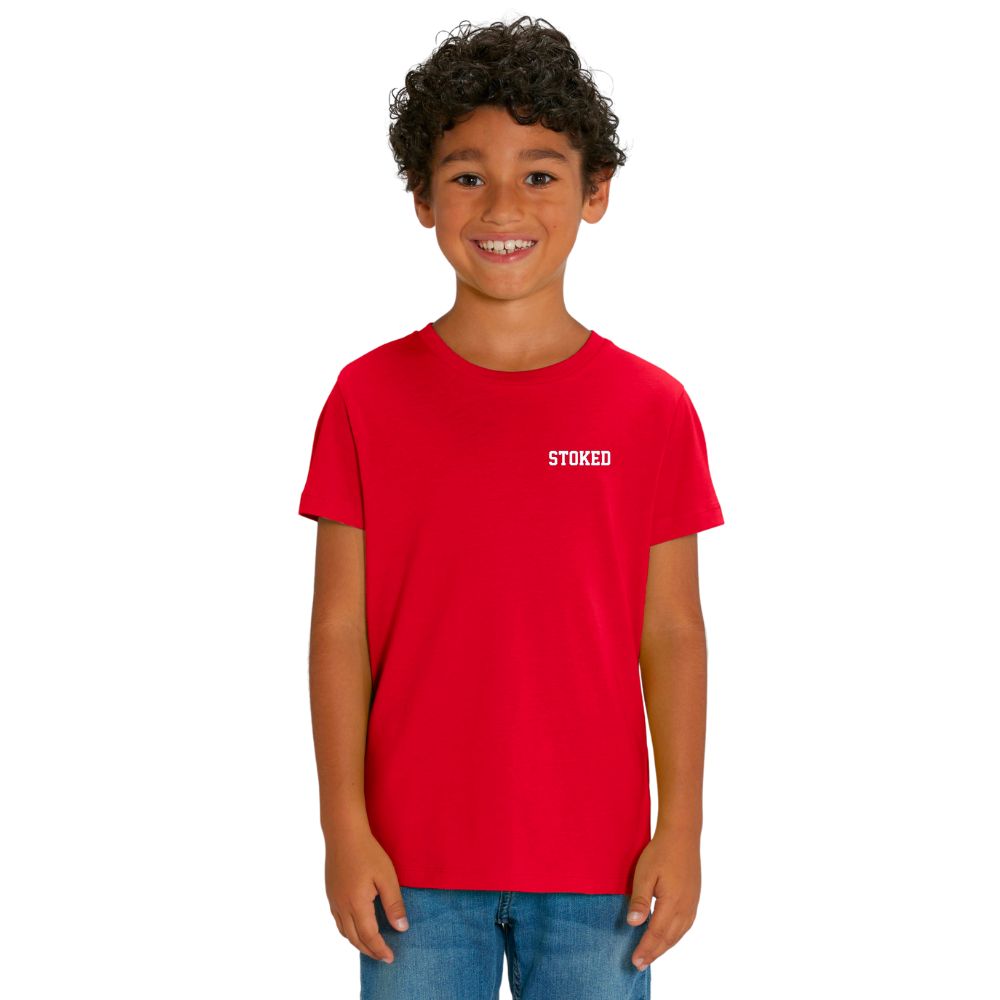 Met de Kids Mini Script T-Shirt Red van Stoked Board Co represent je jouw favoriete boardmerk met classy style. Het Stoked Script logo subtiel op de borst laat zien hoe hyped jij bent en geeft een mooi contrast op de T-shirt. De verstevigingsband in de hals en het breed dubbel stiksel maken deze T-shirt helemaal af.