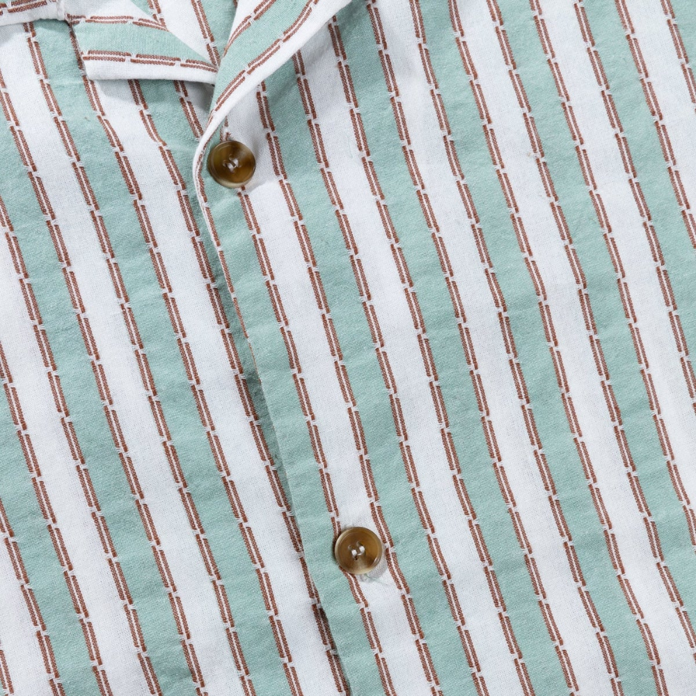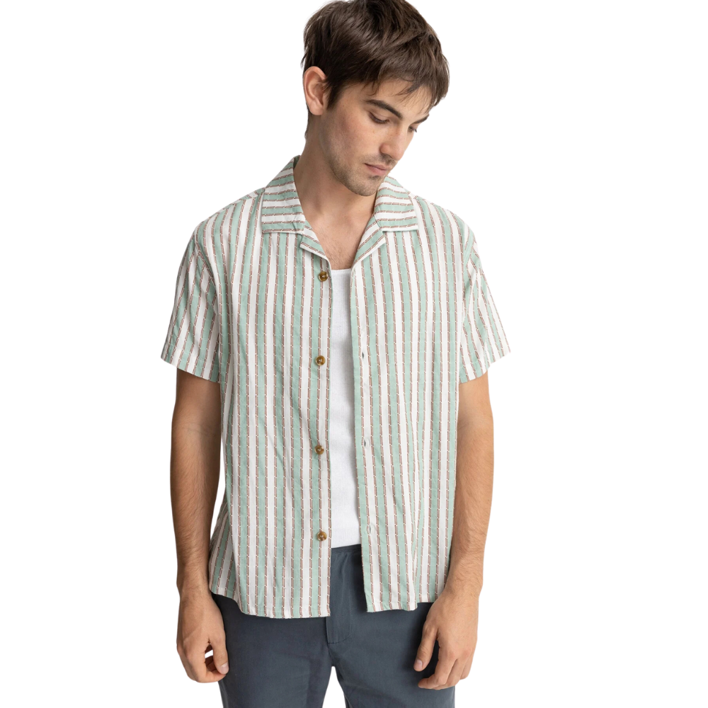 Holen Sie sich mit dem Rhythm Vacation Stripe Shirt Sea Green die Urlaubsstimmung ins Haus. Dieses Hemd mit klassischer kubanischer Passform ist aus strapazierfähiger 100 %iger Baumwolle gefertigt und für Komfort und Stil konzipiert. Die garngefärbten Streifen und der zeitlose gerade Saum machen dieses Hemd zu einem unverzichtbaren Teil jeder Sommergarderobe, ideal für entspannte Tage und Nächte.