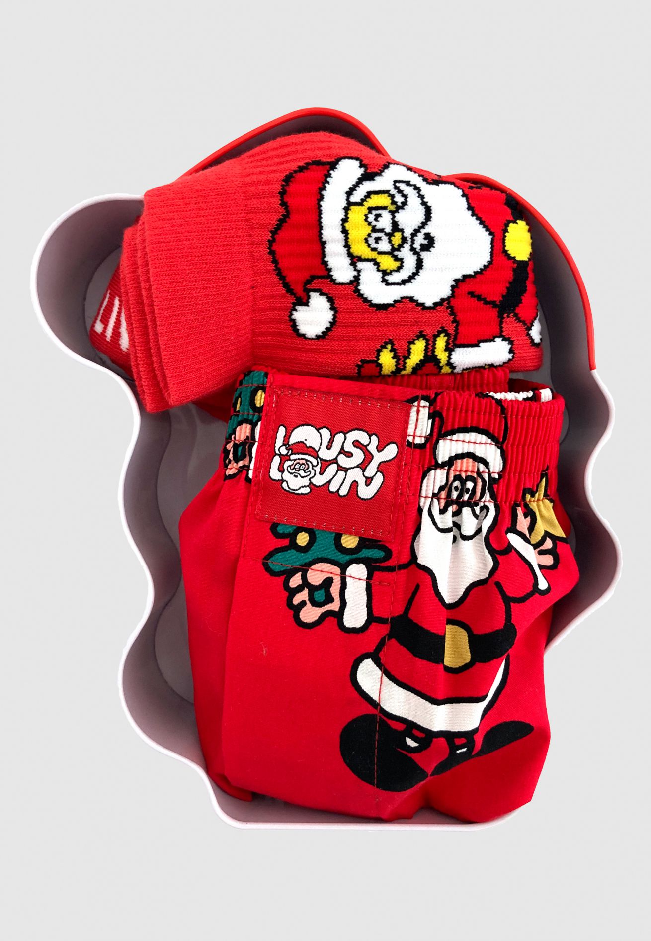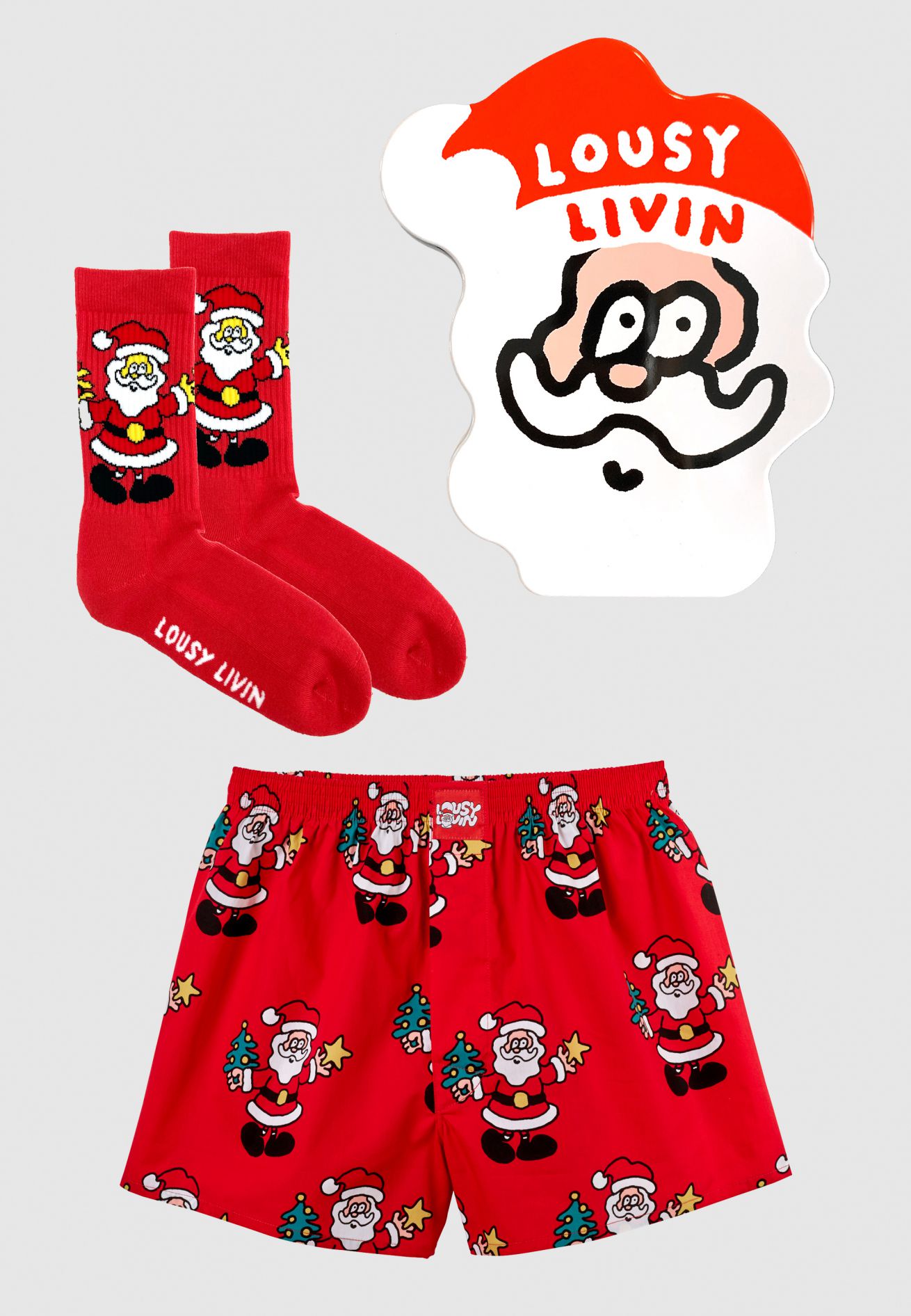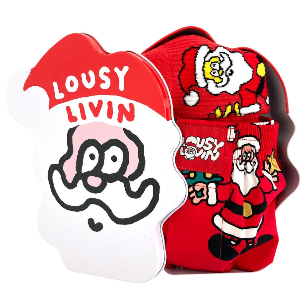 Hier is hij dan, de zeer speciale Lousy Livin Santa kerstcadeaubox. Een op maat gemaakt product met 2 vrolijke items, een boxershort en sokken. Stuk voor stuk 100% biologisch katoen. Het unieke blik is gemaakt van licht metaal.