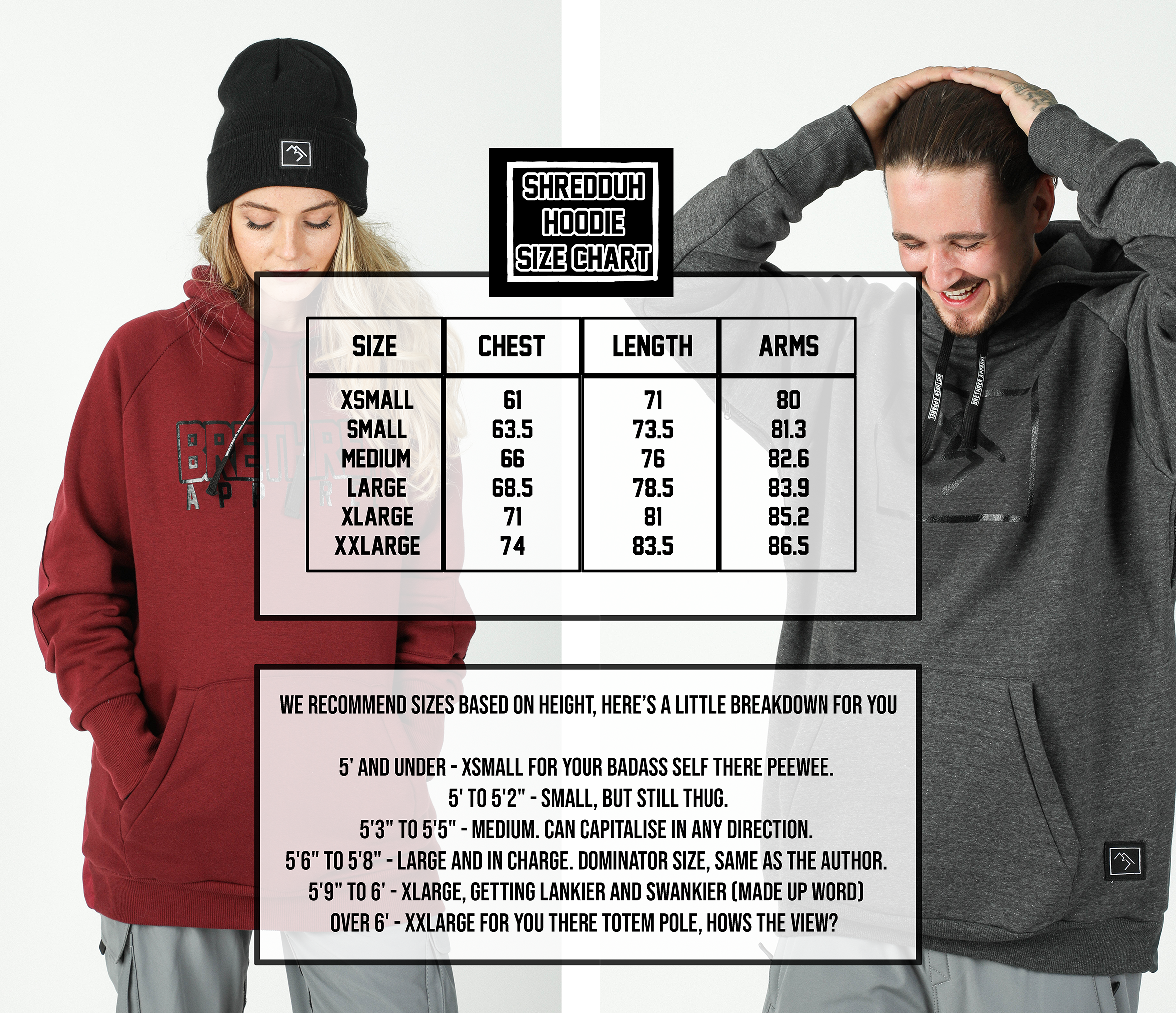 Da ein Shred-Hoodie etwas länger ist, empfehlen wir, die Größe anhand Ihrer Körpergröße zu wählen. Die Tabelle unten hilft Ihnen dabei. Wenn du deinen Hoodie kürzer magst, wähle eine Nummer kleiner.