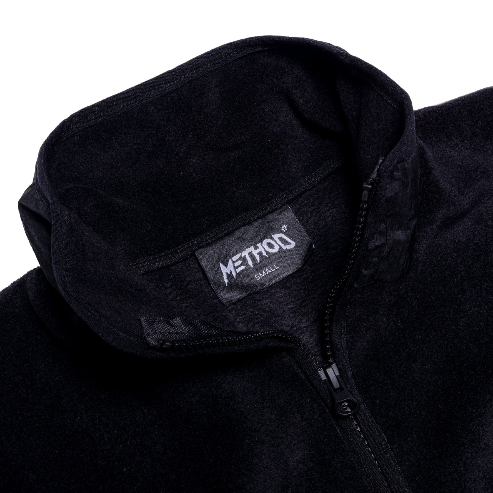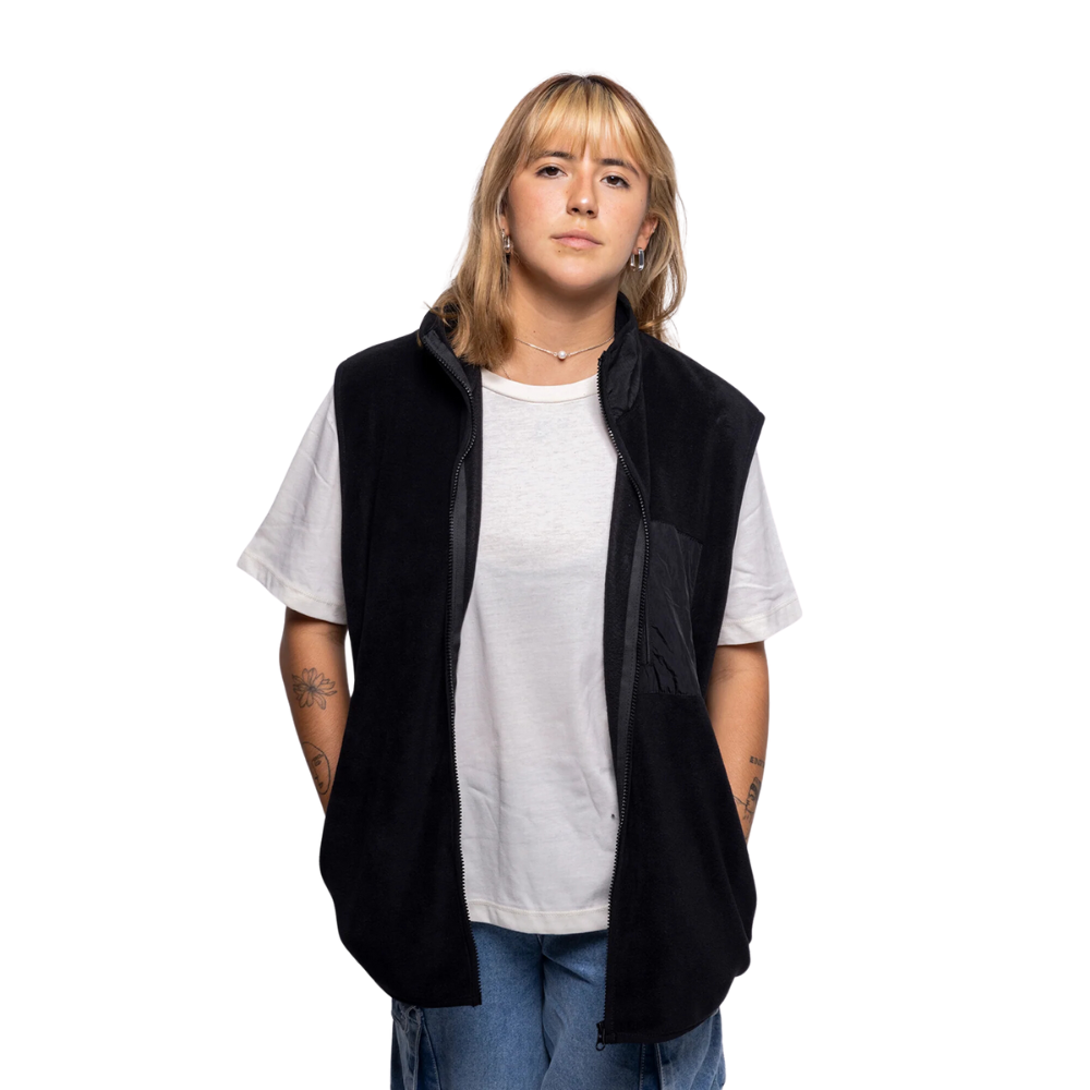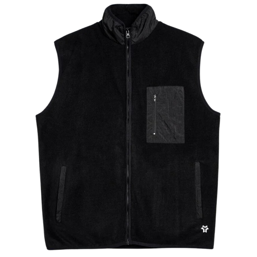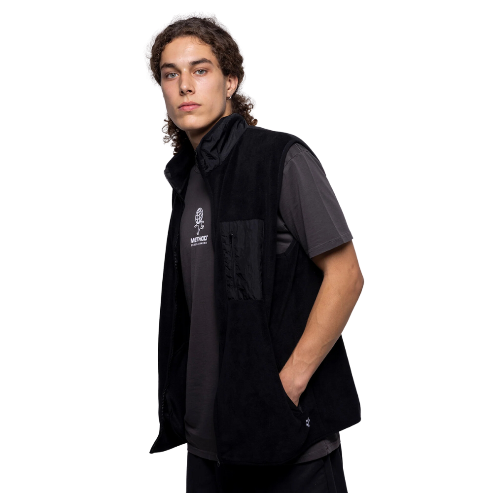 The Method Star Fleece-Weste Schwarz ist eine Fleeceweste aus 100% recyceltem Polyester mit einer lockeren Passform, die sich an wärmeren Tagen perfekt über einem T-Shirt und an kälteren Tagen über einem Hoodie tragen lässt.