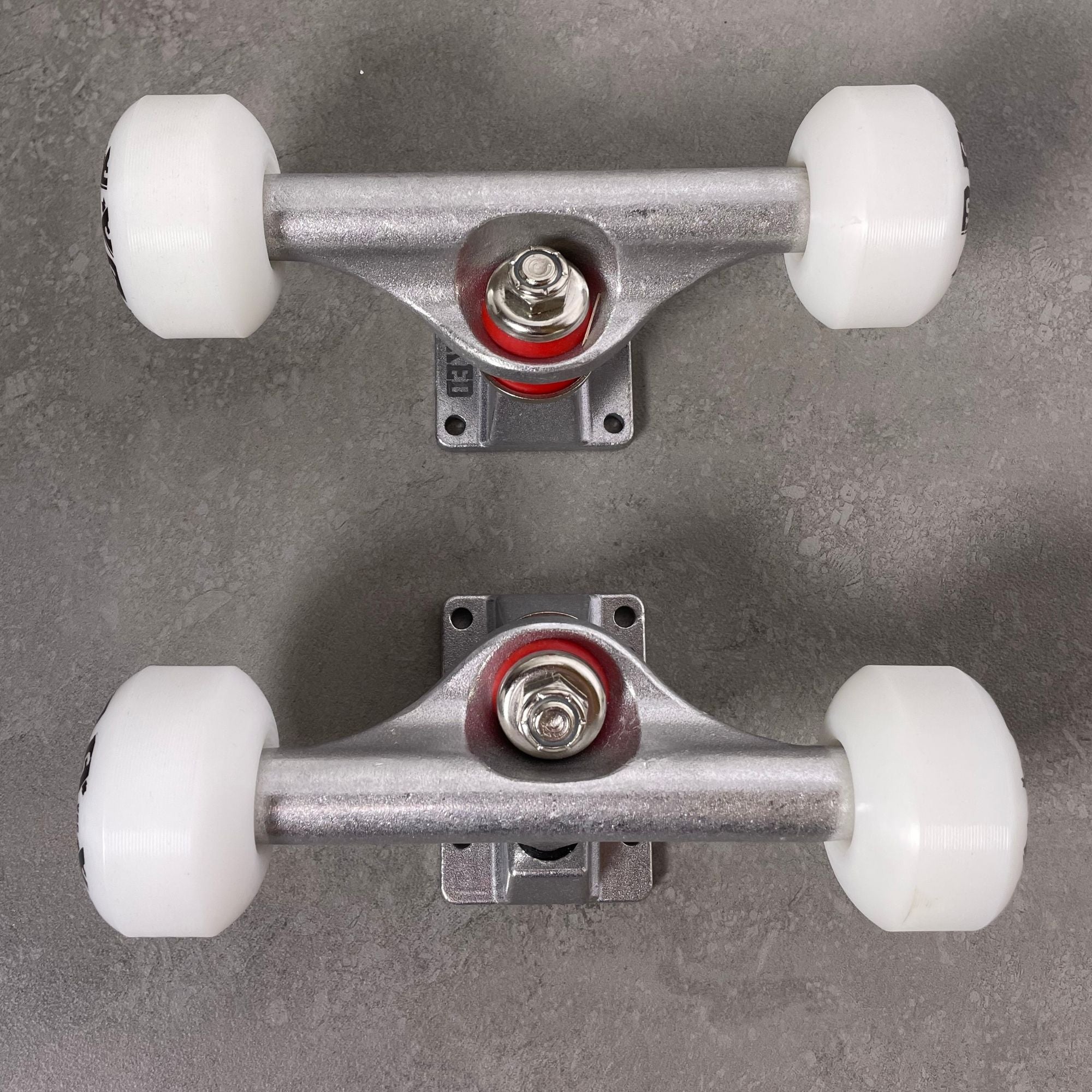 De Trucks van deze setup hebben een hangerbreedte van 5.05". Ideaal voor skateboards van 7.25" tot 7.75". De wieltjes hebben een hardheid van 99a. Perfect om te skaten in het skatepark, maar toch wat zachter voor de straat. Dankzij de abec 7 kogellagers rij je meteen vlot aan stevige snelheid.