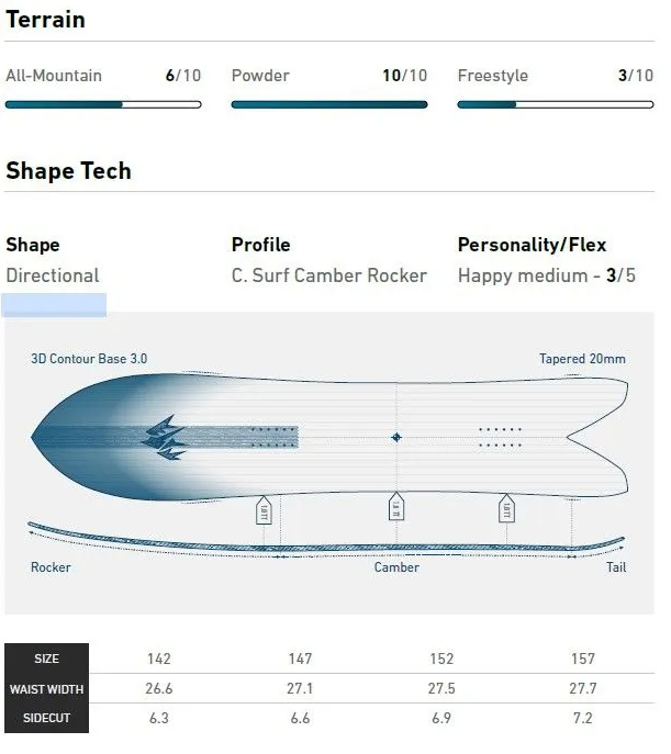 Richtungsweisend - Bei diesem Shape ist die Bindung weiter hinten positioniert, wodurch das Snowboard eine längere Nose erhält. Das macht das Snowboard perfekt für Freeride und All-Mountain und gibt dir mehr Auftrieb im Powder.