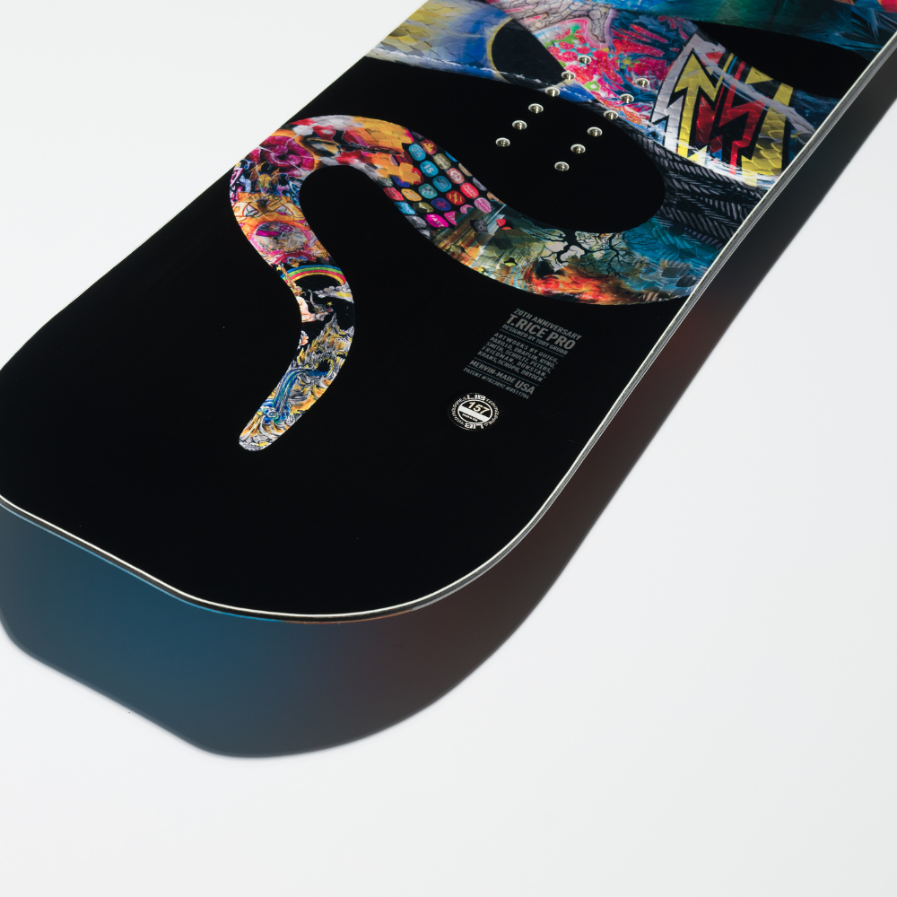Die Lib Tech T.Rice Pro ist das Ergebnis von zwei Jahrzehnten Progression und Präzision direkt aus dem Kopf von Travis Rice. Entwickelt in Jackson Hole, getestet auf der ganzen Welt und ausgestattet mit der leistungsstarken, umweltfreundlichen HP-Konstruktion, ist dies der Freestyle-Twin für Rider, die alles fahren wollen - von Park bis Pow. Er ist spielerisch genug für den täglichen Gebrauch, aber auch stabil und reaktionsschnell genug, um bei Speed, Big Kickern oder technischen Lines an seine Grenzen zu gehen. Diese 20. Jubiläumsedition feiert die Entwicklung einer Legende mit einem Kunstwerk von einer epischen Crew von Künstlern, die das T.Rice Pro über die Jahre hinweg geformt haben.