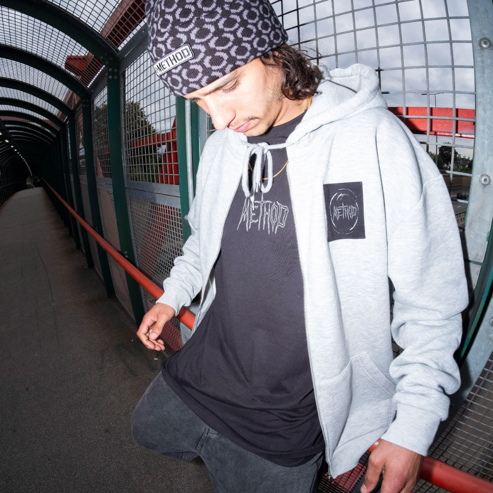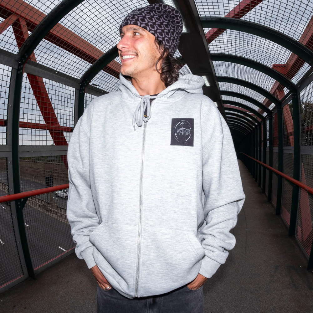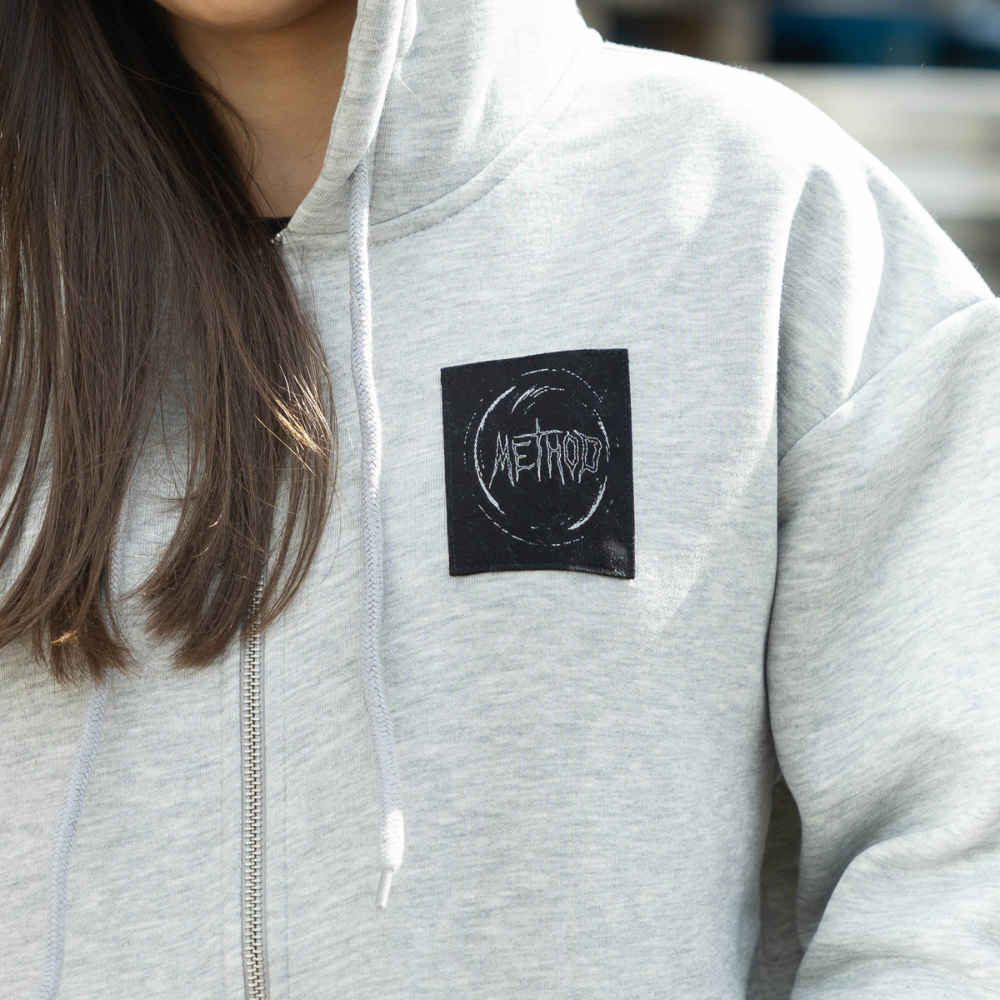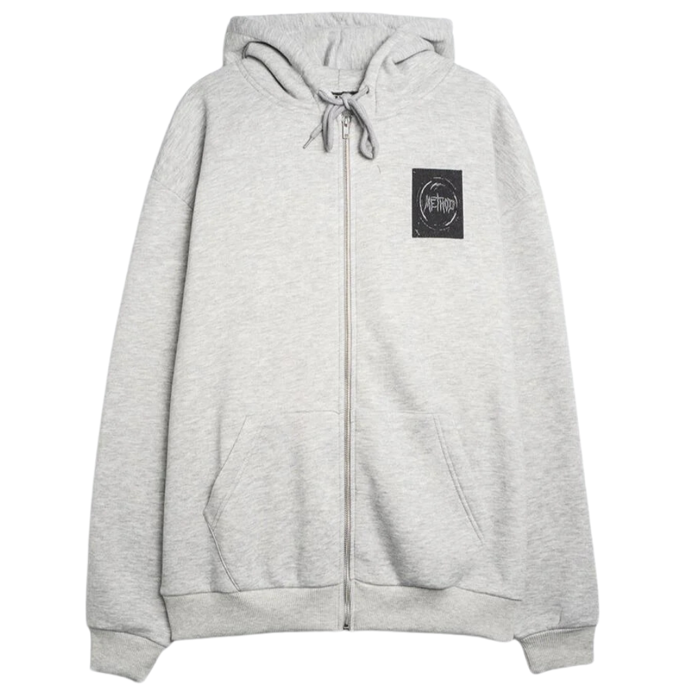 The Method Vortex Zip Hoodie Wettergrau verfügt über einen robusten Metallreißverschluss und einen aufgenähten Stoffaufnäher auf der linken Brust mit dem Vortex-Logo.