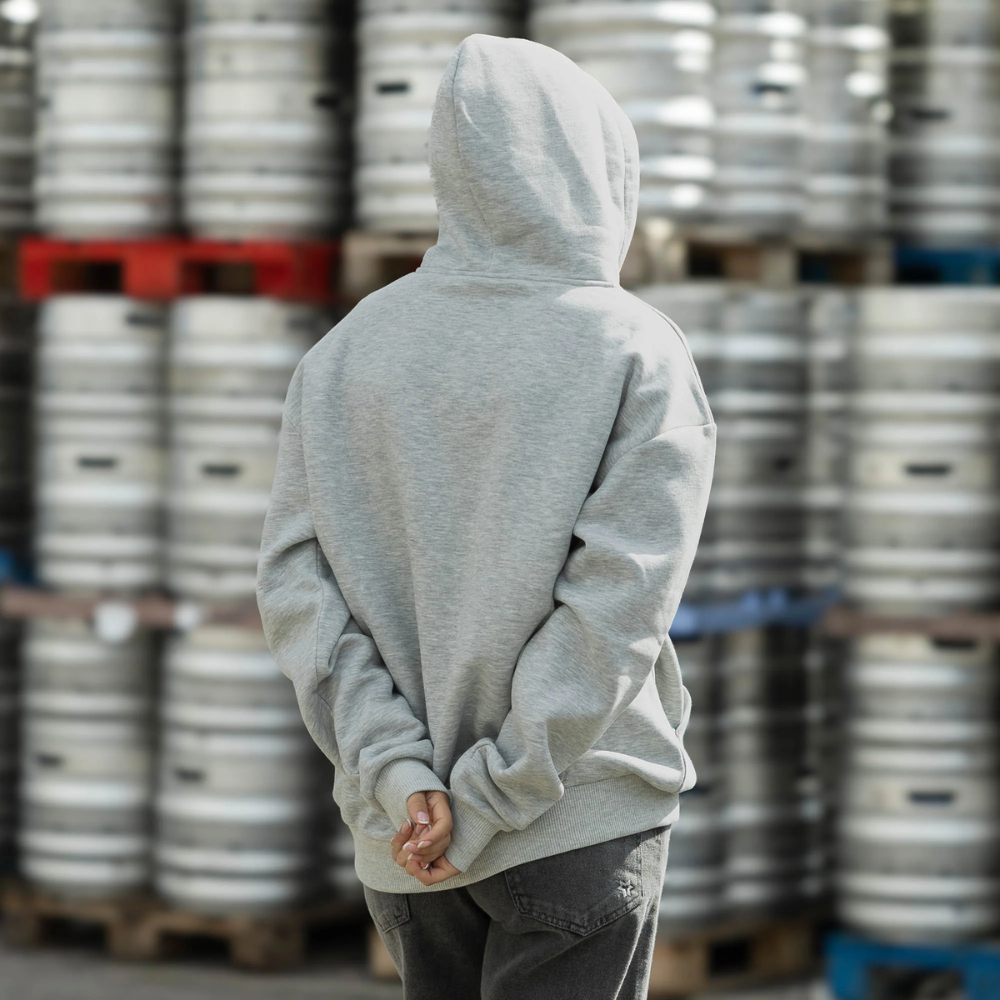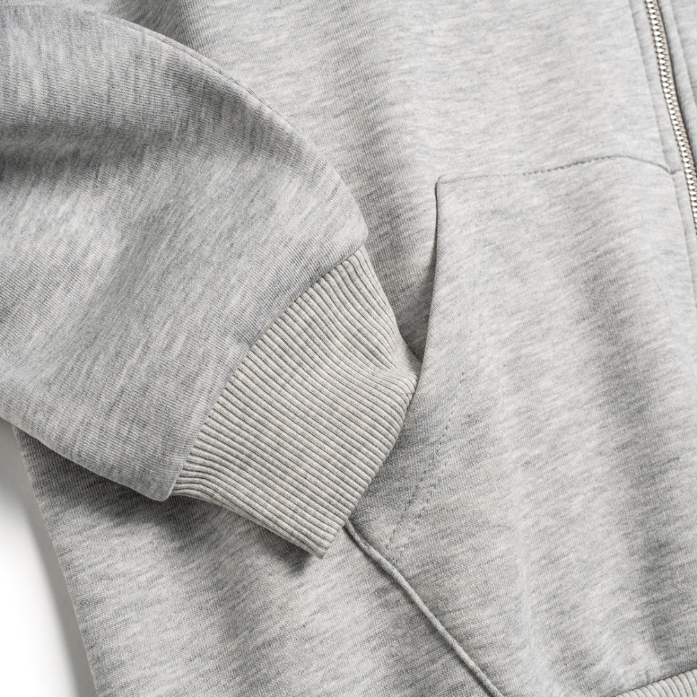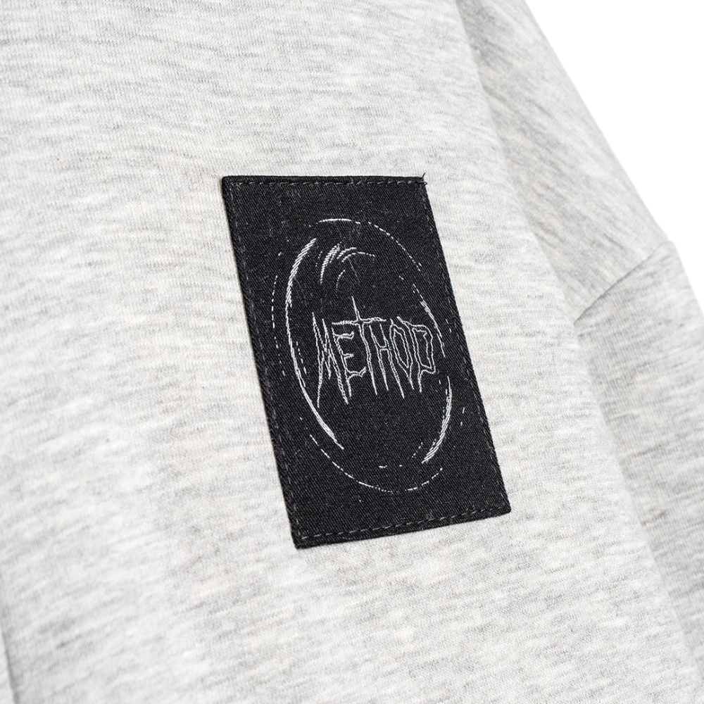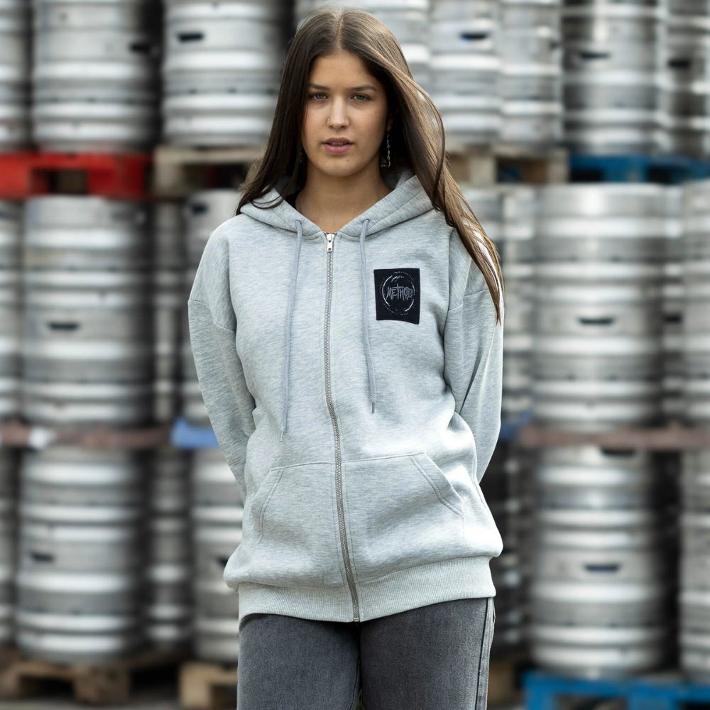 The Method Vortex Zip Hoodie Wettergrau verfügt über einen robusten Metallreißverschluss und einen aufgenähten Stoffaufnäher auf der linken Brust mit dem Vortex-Logo.