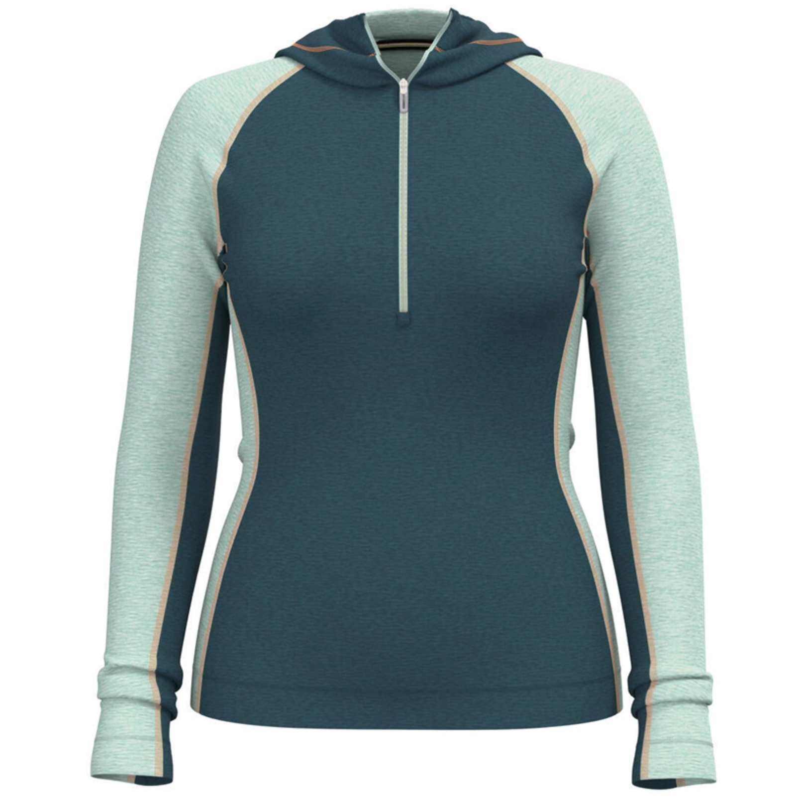 Die Rückennaht umschließt den Körper auf der Vorderseite und sorgt für eine bessere Passform und einen optischen Akzent. Raglanärmel unterstützen die Bewegungsfreiheit und die flache Nahtkonstruktion hilft, Hautirritationen und Scheuerstellen zu minimieren. Der halbe Reißverschluss bietet zusätzliche Belüftungsmöglichkeiten und ermöglicht ein einfaches An- und Ausziehen.