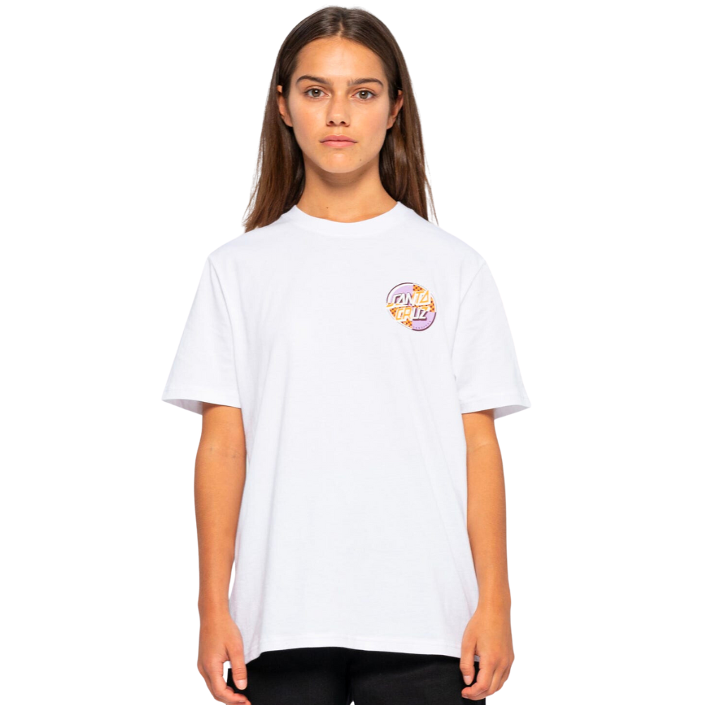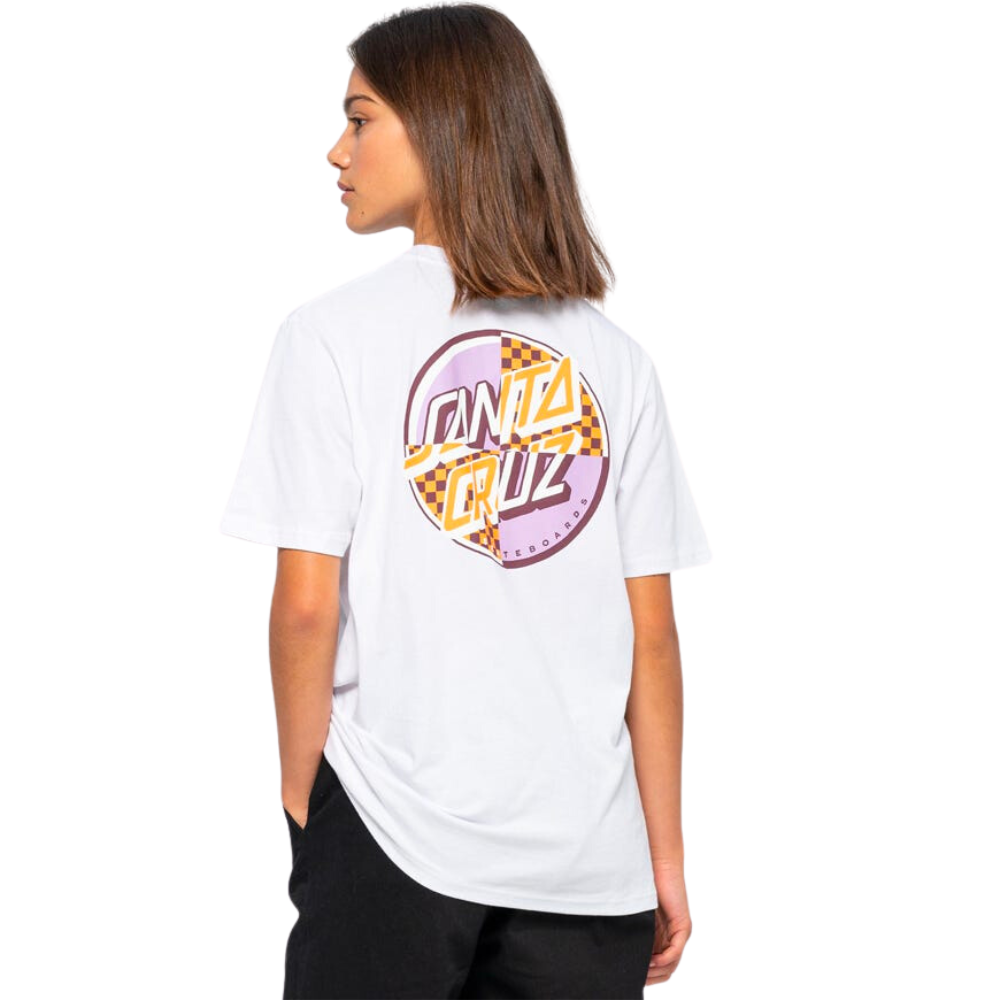 Laat je skatestijl stralen met het Santa Cruz Women's Intro Dot T-Shirt in White. Dit losvallend T-shirt belichaamt de klassieke skatestijl van Santa Cruz, perfect voor vrouwen die hun passie voor de sport in stijl willen uiten.