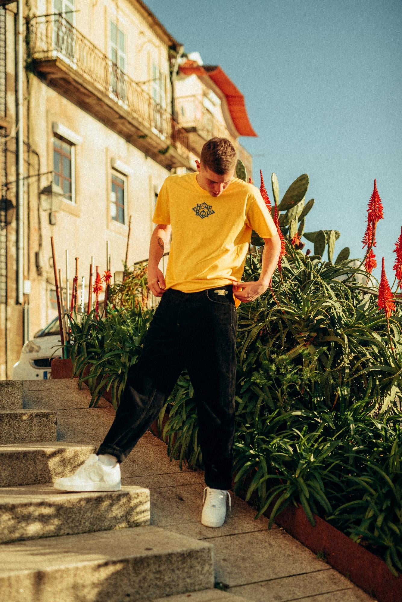 - Het veelkleurige "Homeboy X-tra" borduurwerk onder de tailleband.