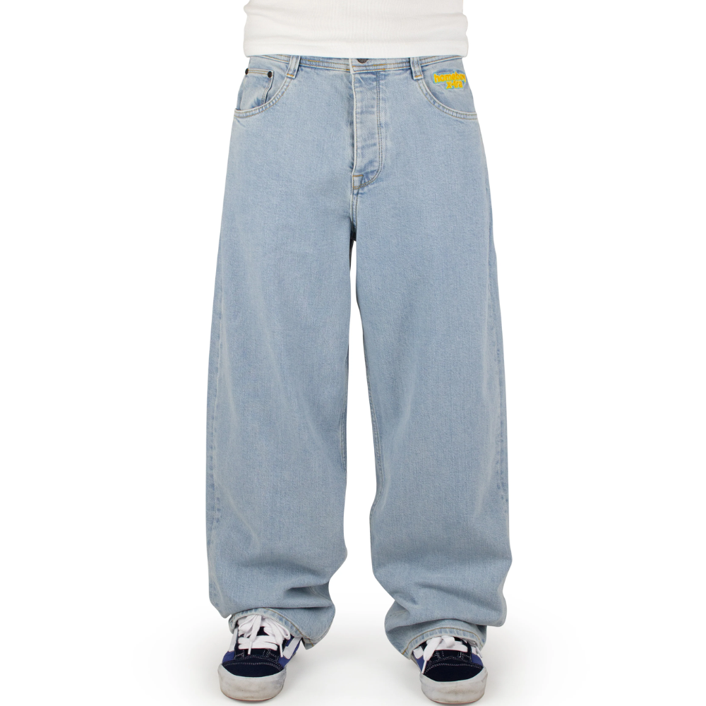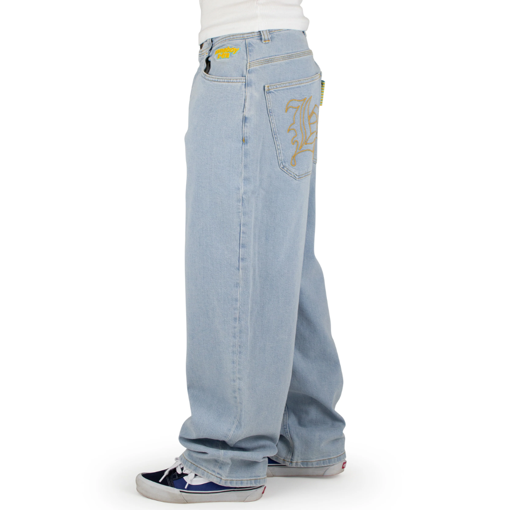 Die Baggy-Jeans verströmt einen authentischen Vintage-Vibe dank originaler Details aus den 90ern, wie der bunten "homeboy x-tra"-Stickerei unterhalb des Bundes, dem auffälligen Rainbow Fly-Tab und der X-Naht auf der Gesäßtasche. Die Gesäßtaschen sind tiefer angesetzt für den charakteristischen Loose-Fit-Look, der diese Jeans wirklich einzigartig macht.
