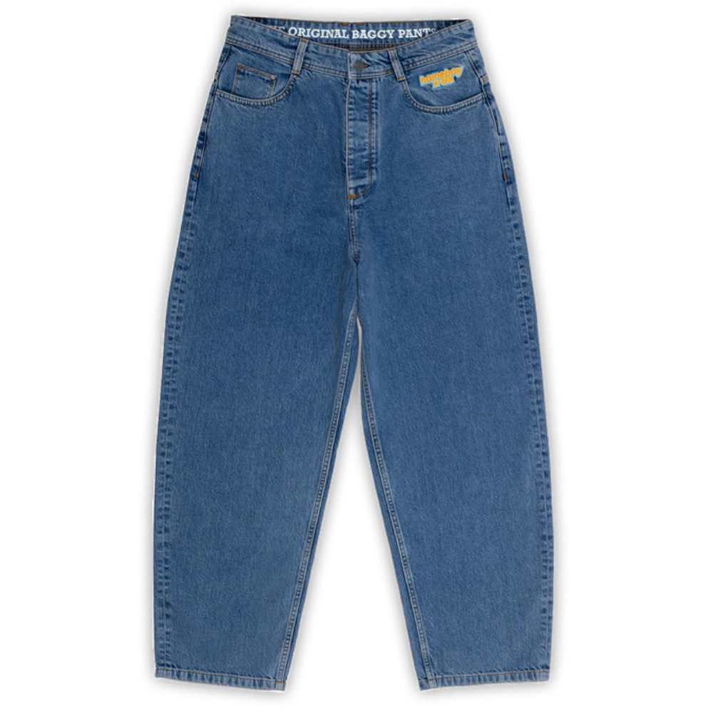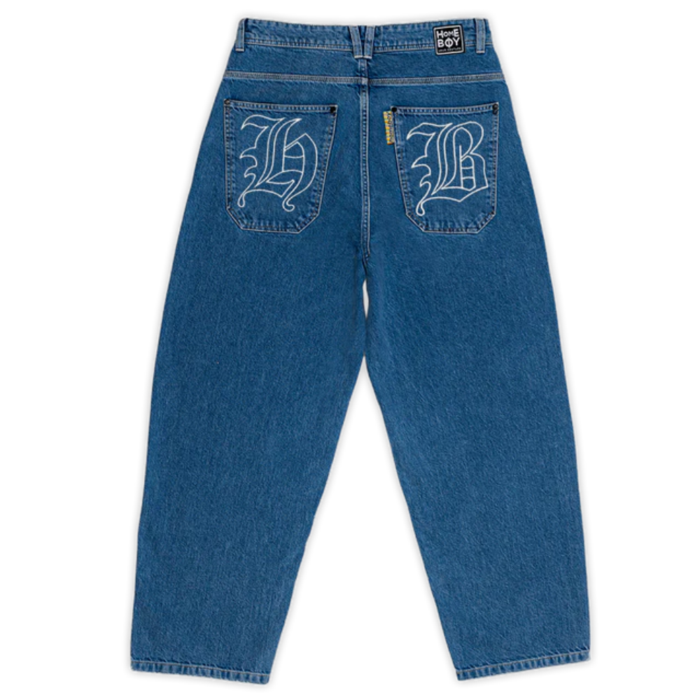Die Homeboy X-tra Monster Gothic Denim in verwaschenem Blau kombiniert den kultigen Baggy-Stil der 90er Jahre mit einem kantigen Gothic-Twist. Die konisch zulaufende Passform verjüngt sich ab dem Knie leicht und hat eine abgeschnittene Länge für eine moderne Passform. Die klassischen Vintage-Details, wie die Homeboy x-tra Stickerei unterhalb des Bunds und der Rainbow Fly-Tab, bleiben erhalten. Was diese Version einzigartig macht, ist die auffällige Gothic-Stickerei auf beiden Gesäßtaschen, die für einen echten Hingucker sorgt.